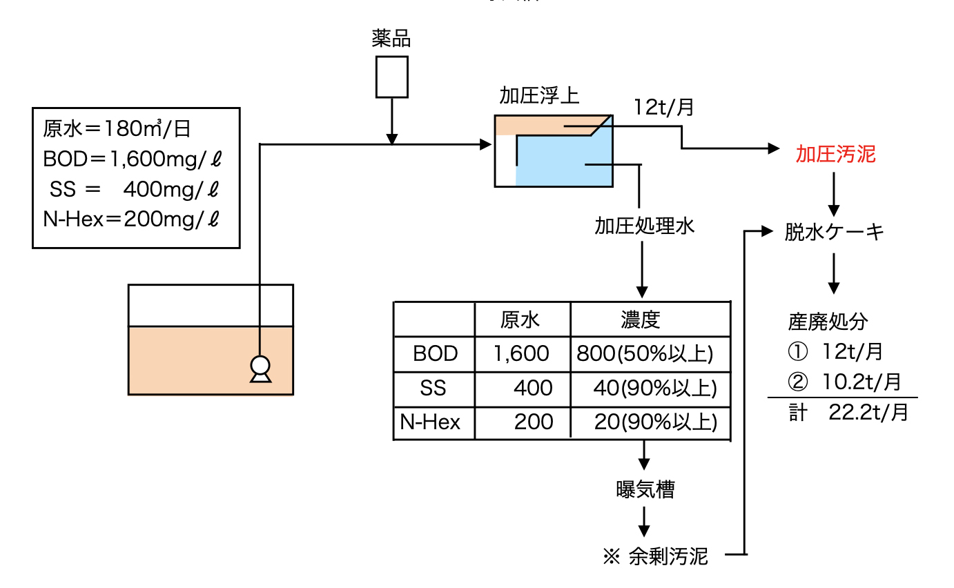 原水のBOD濃度が800mg/ℓを超えた場合の対応策として、加圧浮上槽で対処する方式が普及しています。